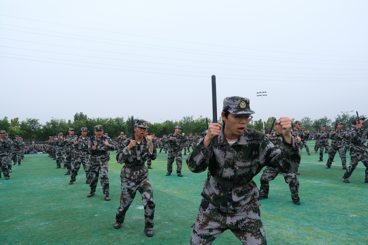 匕首操方队率先亮相,队员们手持匕首,眼神坚毅,“杀!杀!杀!”的呐喊声震彻全场,直刺、横劈、格挡等动作行云流水,既展现出匕首操的凌厉气势,更彰显出学子们敢打敢拼的血性担当,赢得现场阵阵掌声;挂枪队列方队,新生们肩扛步枪,身姿挺拔如松,从齐步走、正步走到分列式变换,步伐高度统一,枪线整齐划一,每一个摆臂、每一次踢腿都精准有力,将军人的严谨与自律展现得淋漓尽致,尽显青春担当;“突刺——刺!”刺杀方队的登场瞬间点燃全场气氛,队员们手持模拟刺杀枪,在教官的指令下完成突刺、防刺、反击等战术动作,动作刚劲有力,气势如虹,让在场师生感受到强烈震撼;徒步队列方队精神抖擞,口号嘹亮,从立定稍息到转向看齐,每一个细节都力求完美,充分展现了新生们经过军训磨砺后的纪律意识与团队协作能力;警棍方队的队员们手持警棍,围绕“防御、控制、反击”展开演示,警棍操与战术配合相结合,动作规范利落,既展现了应对突发情况的处置能力,也让新生在实操中增强了安全防护意识,充分体现军训“强技能、护安全”的育人目标;擒敌方队队员们两两一组,默契配合,展示抱腿顶摔、锁喉别臂等擒敌动作,动作迅猛精准,攻防转换流畅,展现了扎实的训练功底;战术方队队员们模拟战场环境,手持模拟枪械,快速完成匍匐前进、战术卧倒、班组协同等科目演示,展现了新生们对战术技能的熟练掌握,也让在场师生直观感受到军人的战斗素养与家国情怀。